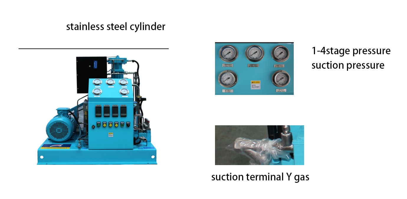 Compressão em quatro estágios, cada estágio é equipado com uma válvula de segurança, a entrada é equipada com proteção de baixa pressão de admissão, a extremidade de exaustão é equipada com proteção de alta pressão de exaustão e cada estágio tem um sensor de temperatura. Se houver temperatura excessiva e pressão excessiva, o sistema disparará um alarme e parará, garantindo uma operação segura, tamanho pequeno, peso leve e posição de estacionamento da empilhadeira na parte inferior, que pode ser facilmente movida.